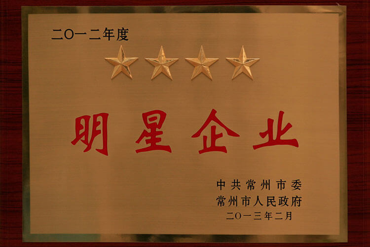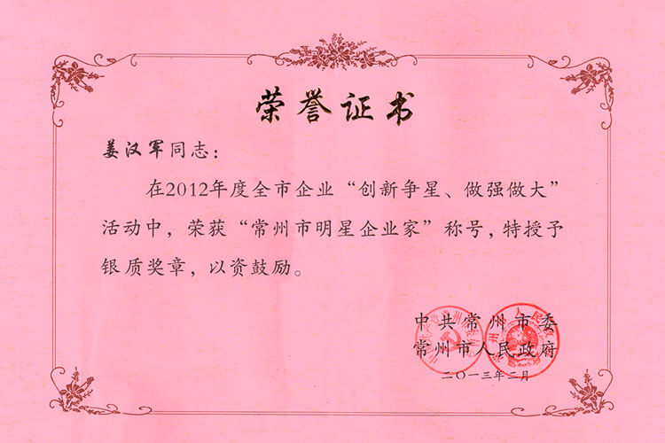 新年公司捷報頻傳。公司榮獲“工業四星企業”的榮譽稱號,公司董事長兼總經理姜漢軍被常州市委、市政府授予“工業明星企業家”的榮譽稱號。